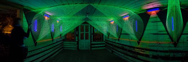 I am a site-responsive artist. My process involves the use of simple, temporary materials that evolve into sculptural work that largely depends on a moment in time. With twine and often blacklight, I make three-dimensional drawings to emphasize obscured elements within recognizable objects and correlate the symbolic with lived experience. My work is multi-sensory and requests participatory involvement: lines expand and contract in space in a visually manipulative manner to engulf the visual senses. I create a kinetic and relational art experience that reawakens for a moment the simple intrigue of looking and encourages the appreciation of spaces for what they are while also examining their hidden meanings. Inspired by both interior and exterior spaces, I look for sites where nature has been permeated by manufactured elements or ways in which structures can communicate certain particulars about the current human condition. Both natural and synthetic light is used as a drawing medium to bring my sculptural installations to life, the lines becoming ethereal elements that establish otherworldliness and invoke curiosity as they expand and contract in space