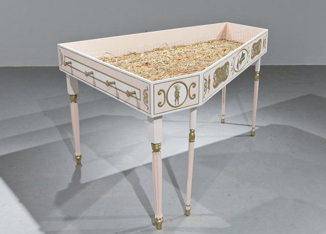 I make installation-based projects that use a variety of material approaches centering around animals. I consider myself part of larger work going on in many different disciplines that strives to take animals seriously as a subject and recognizes the many complicated ways animals figure into our understanding of the world. That means that at the heart of my work are questions about how we know what we know. I use installations because they allow me to put together a lot of intersecting objects, images, and texts in ways that I hope are generative. I choose materials and forms based on the content, though my training was originally in traditional oil painting and drawing.