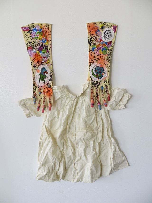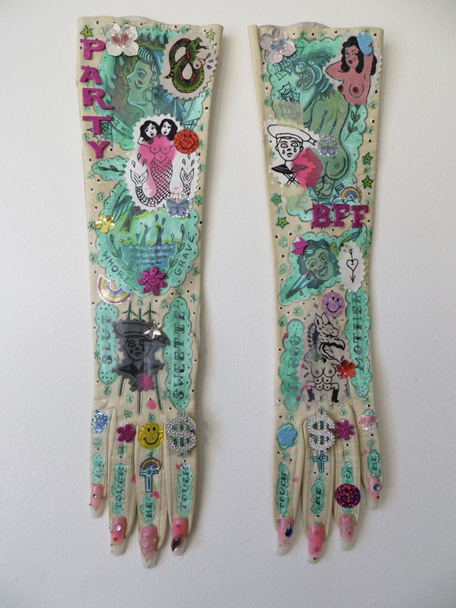 I am hesitant to describe anything I do with too much specificity because I hate to pigeon hole the work I do. I am most well known for the painted “tattooed” vintage women’s gloves. I see myself as a painter as well as an illustrator, I work with fabric and I use photography as well. So mixed media/artistic mag pie would be the best over all description of the medium.