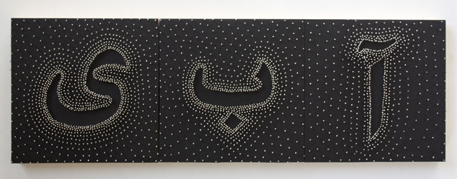 These are rich areas of inspiration for my work. At the same time, I am trying to simplify these concepts and reduce them to their essence. This sometimes calls for a switch in media or approach. For example, some of my work are small panels that show Farsi characters on them. I use sequin pins to create the shape of each individual character. The act of pushing in the pins and poking through a membrane lasts only a second and then disappears. Just like the fleeting pain that I experience every time I push in a pin, the memories that take me back in time are bitter sweet and fleeting. It would not have been possible to convey this idea of transient memories if I wanted to paint them.