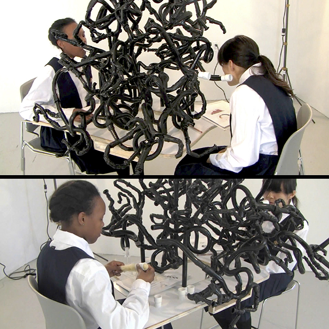 Structure Study I, 2012, Enamel paint on PVC and ABS plastic, plywood, vinyl, cotton, alcohol in spray bottle, found chairs.