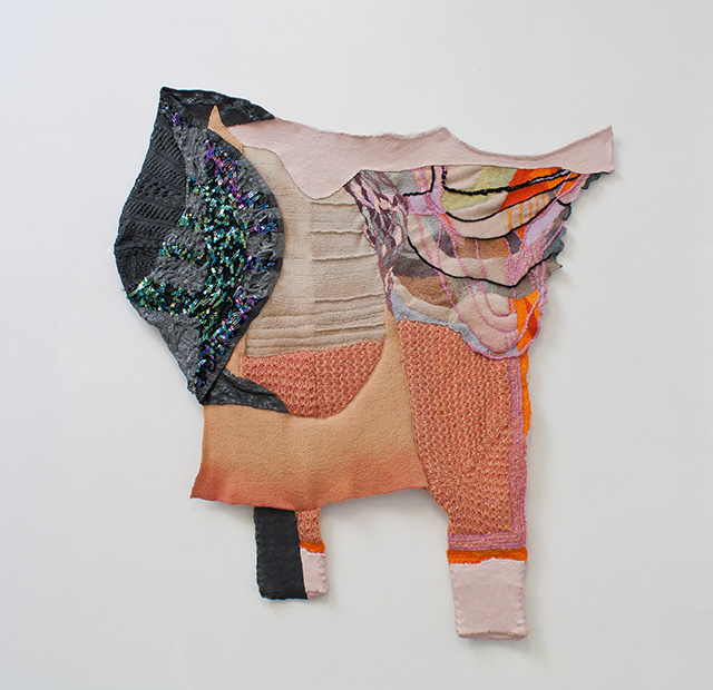 I use time-intensive fiber processes such as embroidery, knitting, and crochet to influence both the length and the quality of a viewer’s perceptual involvement. Viewers become entangled in visually picking apart the minute details of these accumulative processes, but I believe their captivation also stems from a human desire for the intimacy, connection, and human interaction that is embodied in each stitch.