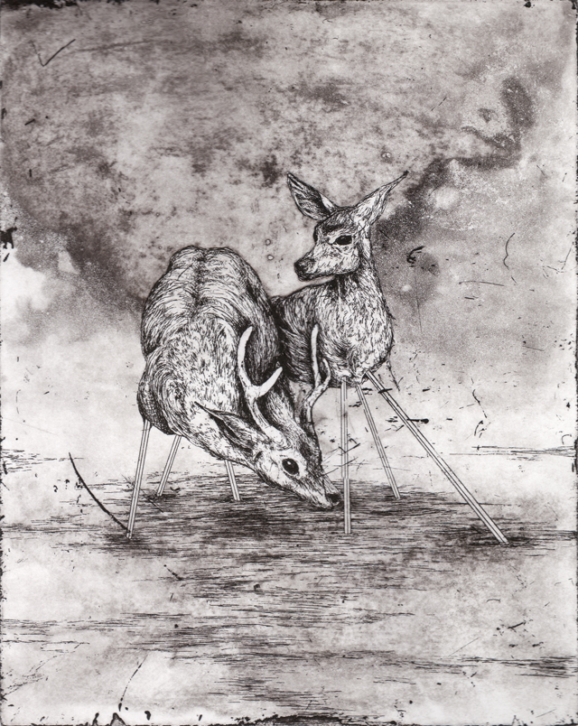 The medium of printmaking has historically been a communal one with many printmakers and artists working collaboratively in a studio. I find that I split my time between working alone in a traditional sense, and working in the print studio, with fellow artists. I get a lot of drawing done alone in the studio with a nature documentary or show in the background, but I finish up my work in the print shop with other people around (I like the convenience of having a second opinion when I want it.) Most of my idea generation occurs away from my drawing desk, through walks in nature, long drives, airplane rides, etc. I am fascinated by texture and I’m constantly searching for new and unique ones.