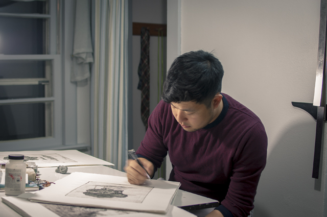 I try to do something every day, a little doodle to a large-scale drawing, but it’s a little hard when inspiration is thin. I like to work mainly at night, when distractions on the Internet and TV are very minimal. I prefer to find long stretches of time where I can work on a project – I gain momentum after about two or three hours of work. If I’m not making work, I’m thinking about making it.