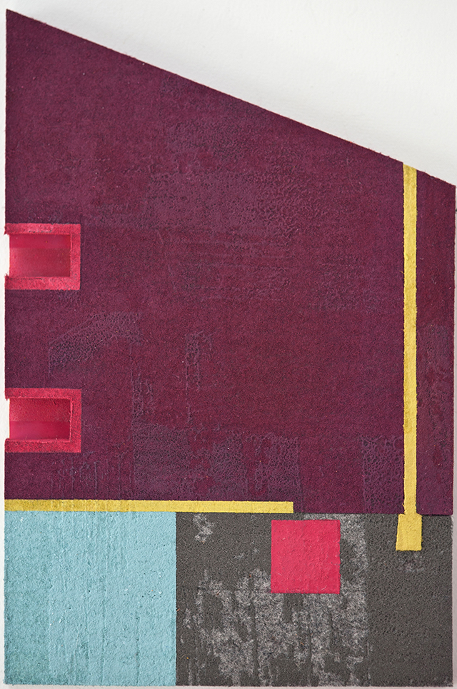 I am fascinated by the language of spatial relationships and by the effect of architectural form and structure on the psychology of the human environment. I work in series; each one begins with extensive photographic documentation that is an integral part of my process. From these photographic “sketches” I extract elements of the built environment that inform my geometric abstractions: spaces between and above buildings, grids of windows, exterior piping, fire escapes, doorways, gables and entablatures all manifest themselves in my paintings. I often exhibit the paintings in combination with site-responsive wall drawings that extend this vocabulary onto the surfaces of the room.