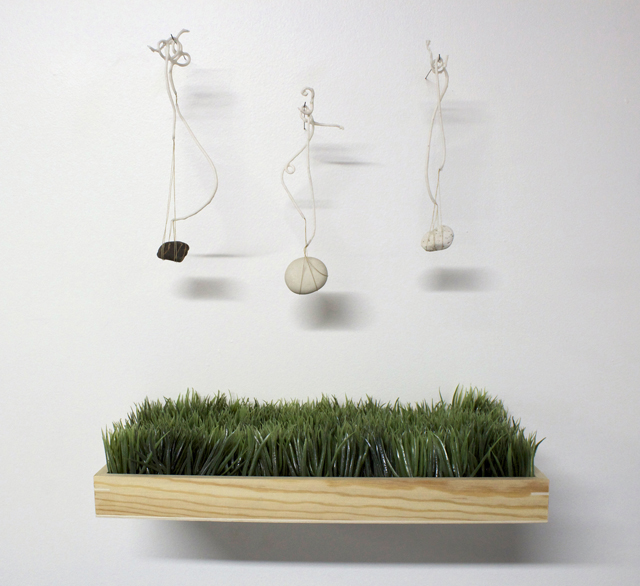 The Weight of Translation, 2014, Porcelain thread, cotton thread, rocks from my collection: gneiss, porcelain, pumice, synthetic grass, wood.
