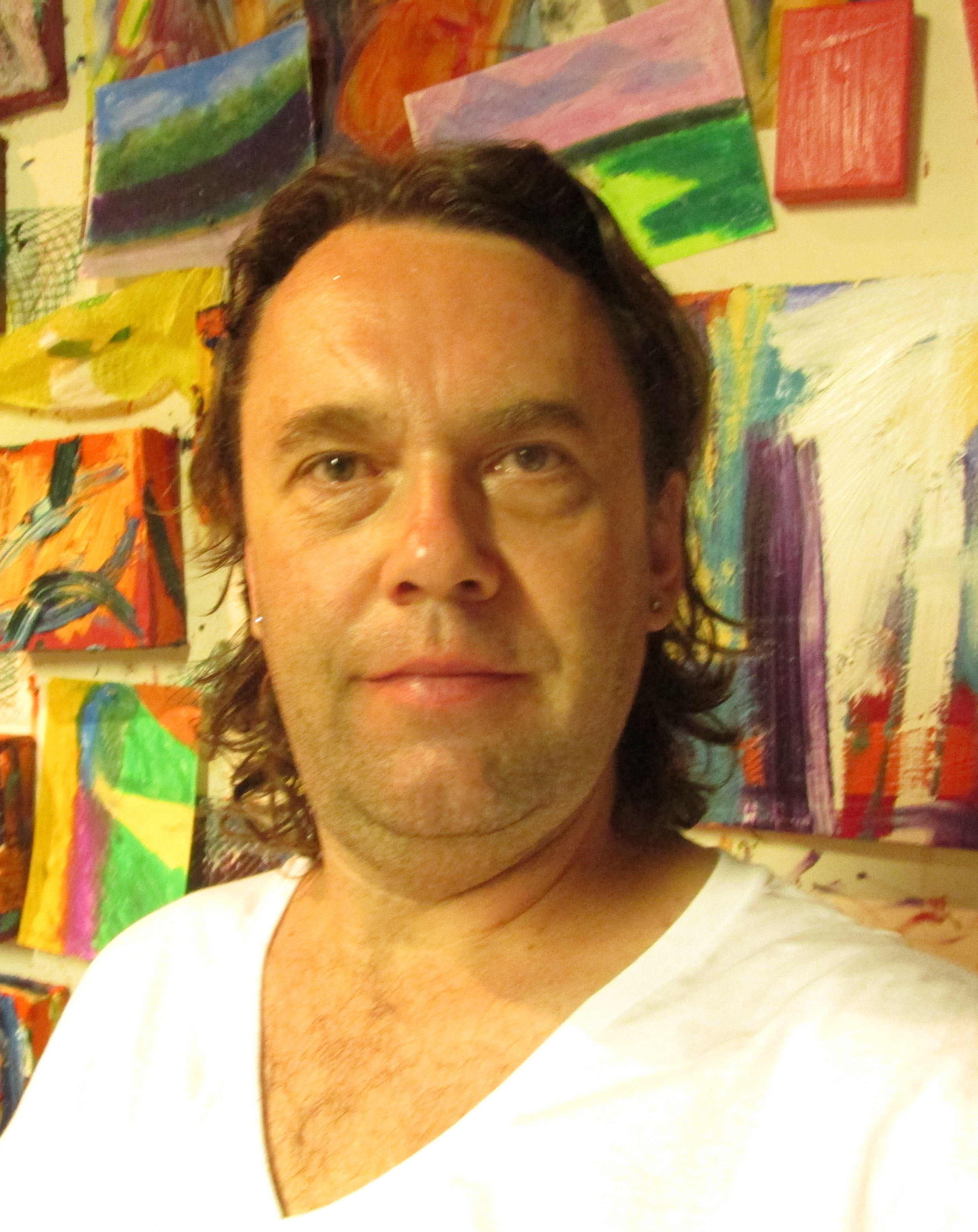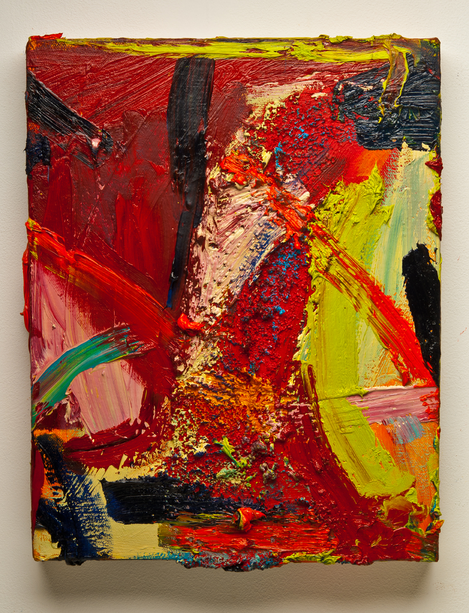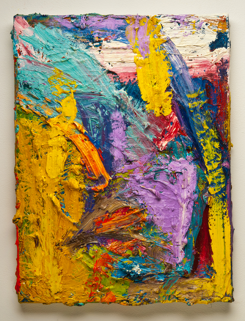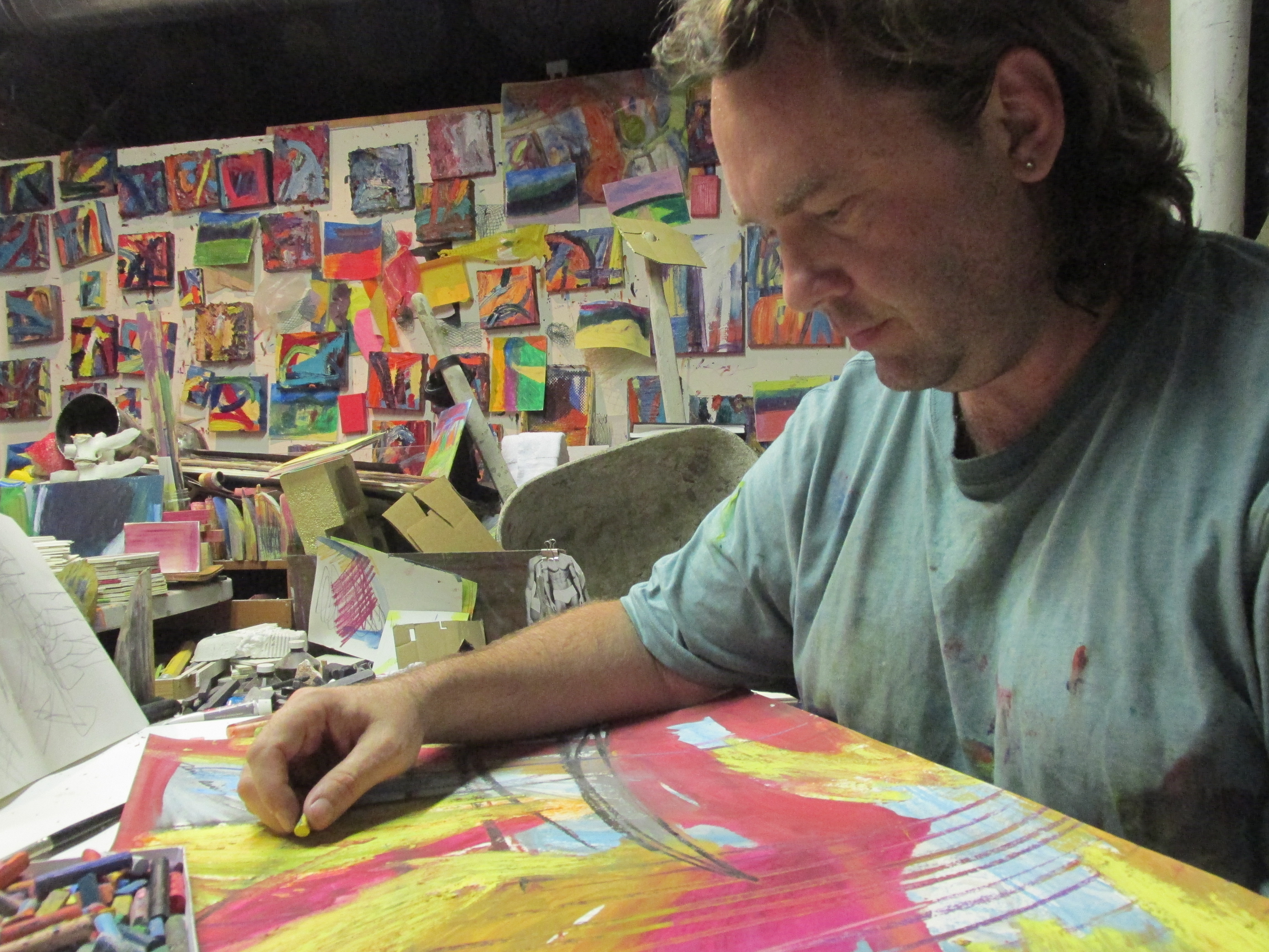 I am an abstract painter. I create small scale works dealing with lots of color and texture based on my experiences of my environments. In my studio I have five places I work at and and a spot for sitting and observing. One place is dedicated for my oil paint. I have an old window I squirt oil paint on from my tubes. Another table is for mixed media drawing. I love creating hundred of works on paper with gouache, pastel, graphite, oil pastel, watercolor, ink, color pencils, and watercolor crayons. Mark making and layering, I love it. Color too of course. 🙂 Two other areas are used for drawing and working on multiple media projects and one place for working with plaster cast, breaking, assembling and painting them.