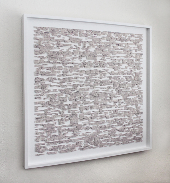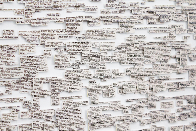 His current studio work focuses on story/information narrative and how information can be processed and confused by and through people. The work takes on two formats: medium to large-scale installations composed of paper word balloons taken from comic books and smaller crosshatch drawings on top of comic pages.