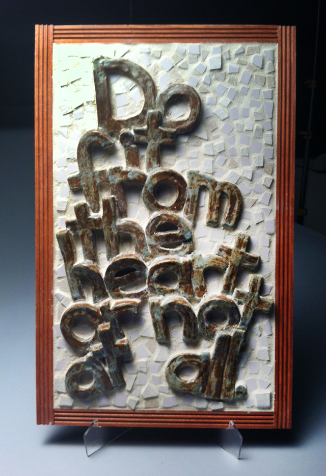 The work I do is a reflection on life, communication, responsibility and love. I appropriate text from music, literature, film, conversations and create visual pieces that capture the heart of what is being said. I also work to question language as a means of communication, how differences in the way that we speak and hear can often challenge true connection.