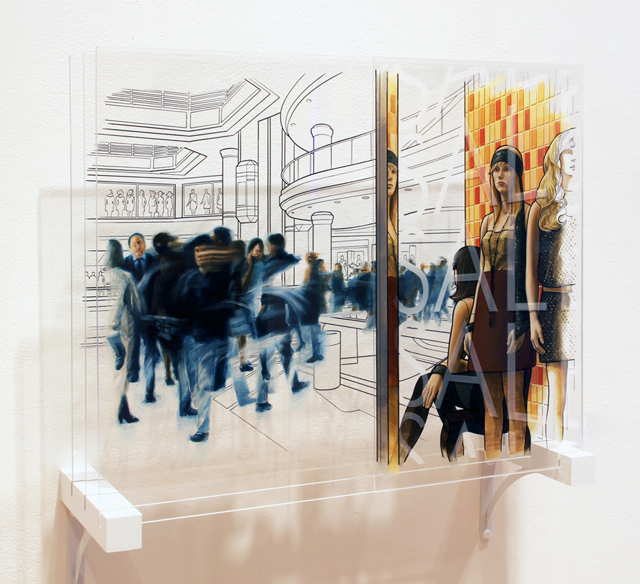 The visual information offered fragmented on multiple layers of plexiglass urges onlookers to make meaning of the whole. Different views provide juxtapositions of figure and ground, flatness and depth, while simultaneously highlighting the physical emptiness between surfaces. By depicting seemingly banal scenes on plexiglass, I encourage viewers to reflect upon the multiple levels of meaning often overlooked as we navigate an increasingly complex modern world.