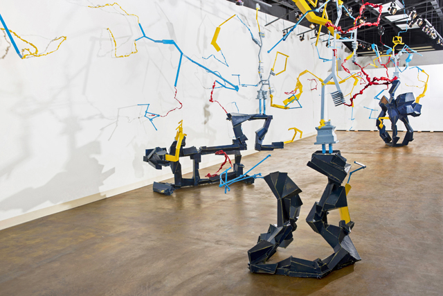 Developing an installation requires both design and engineering. There’s a push and pull between my desire to fabricate an imaginative landscape and the physical limitations of the space itself. I need to consider the technical logistics early on in the process and resolve how the forms are going to exist in space. I also have to determine how the parts are going to break down so I can efficiently transport the work and then reassemble it quickly on site. As a result, I work to design compact parts that readily expand in volume to fill and activate the exhibition space available.
