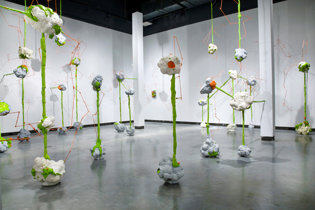 My primary focus is sculpture and I work to create immersive sculpture environments that invite viewers into imagined biological systems. I intend for the works to be moved through and experienced both visually and spatially. I also work on related drawings that involve a process of cutting and layering paper. The drawings started as a bi-product of the installations but they’ve emerged as an important counterpart in my studio practice.