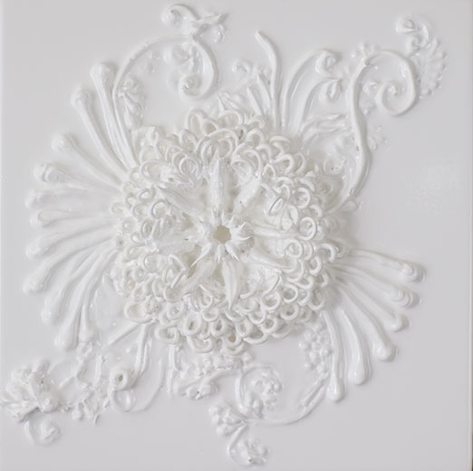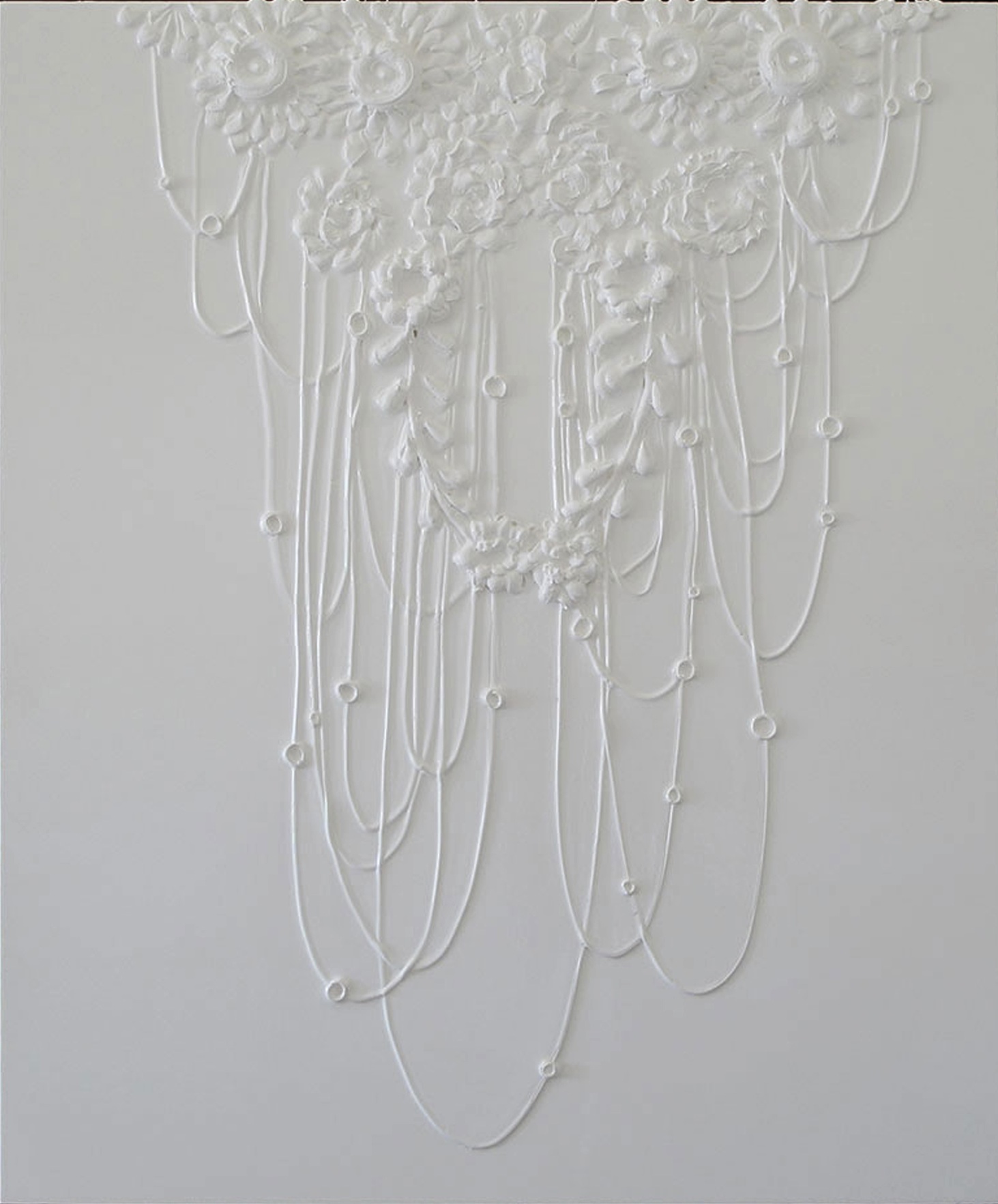 I hand sculpt white on white acrylic polymer.A paean to nature, I translate the luxuriance, sensuality and fecundity found in flora and the ornamental. In an artist residency in the Czech Republic, I lived and painted in an 18th Century palace—an immersion in the splendors of the baroque and rococo, which impressed upon me the ties between the decorative arts and the narrative, myth-making power of contemporary abstract painting. They are pure, meditative, and sacred, painterly and sculptural, minimalist and maximalist, serene and dramatic, with undertones of danger and seduction. I aim to bring viewers back into touch with the opulent physicality of art, and to remind them of the beauty within themselves.
