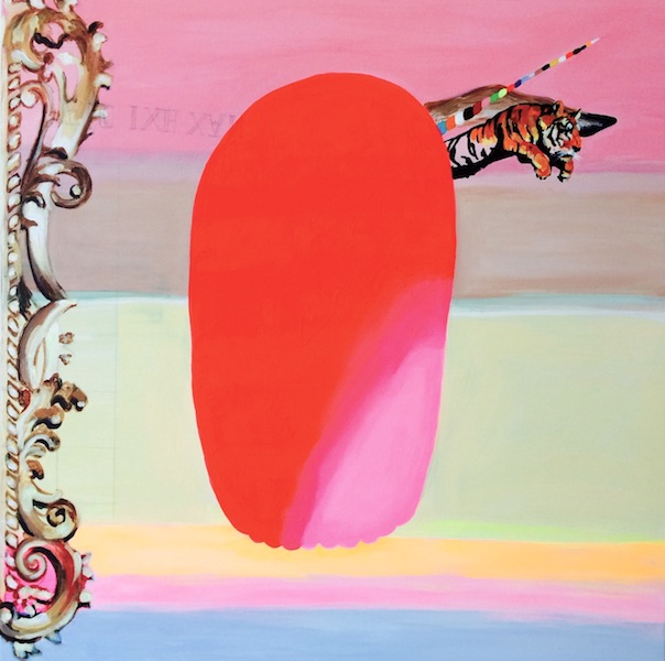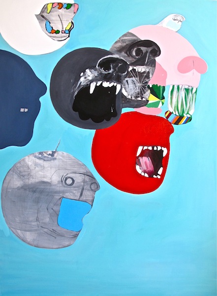 I grew up in 1970’s Hawaii, and Japanese anime is a nostalgic and constant influence – Hello Kitty, Asian super heroes, all the trading stickers and cheesy, subtitled TV shows. I was also a Graphic Design undergraduate major, and love great logos, commercials, and discovering new fonts. Another design influence is my use of the grid to enlarge and transfer images to the canvas. I find the process both meditative and incredibly stimulating. Regarding imagery, I often use dogs as a starting figure. When my parents divorced, my dad adopted over thirteen dogs, so they bring with them strong associations. Lately, I had several teeth and jaw issues, so those have found their way into my work as well!