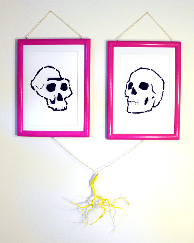 My concepts, and sometimes my methods and aesthetic, can vary from one body of work to the next. Generally, however, my concepts deal with the Self—my self, and the archetypal self. My current body of work is about the human animal– a meditation on the modern human—and the things we’ve given up, and the things we’ve gained from being members of a civilized society. Our trappings are absurd, in some cases, but I refrain from judgment, and instead rely on surreal humor to have this discussion with the viewer. I’m a fabricator/maker, and my materials and methods vary from casting to sculpting clay, from wood working to assembling found objects, from sewing to collage.