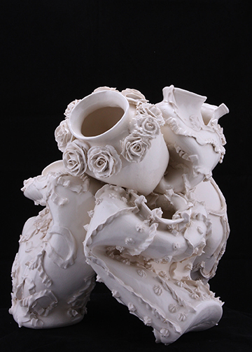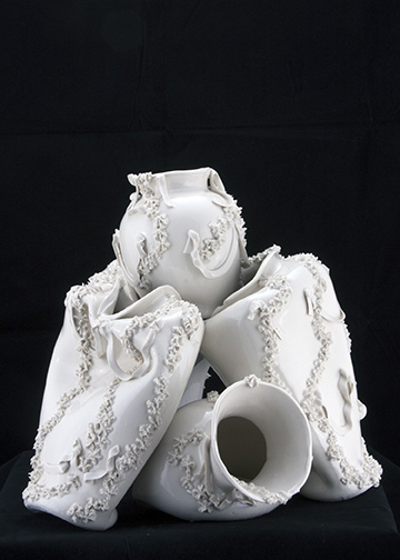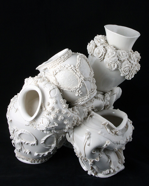 It was in undergrad that I dabbled in the ceramics department filling all of my electives with ceramics classes becoming an honorary ceramics major. It was in graduate school at SMFA/Tufts that I went back to clay and as my thesis “Fill Me Up” a 106 piece ceramic installation. this set me on my continued exploration of desire through porcelain.