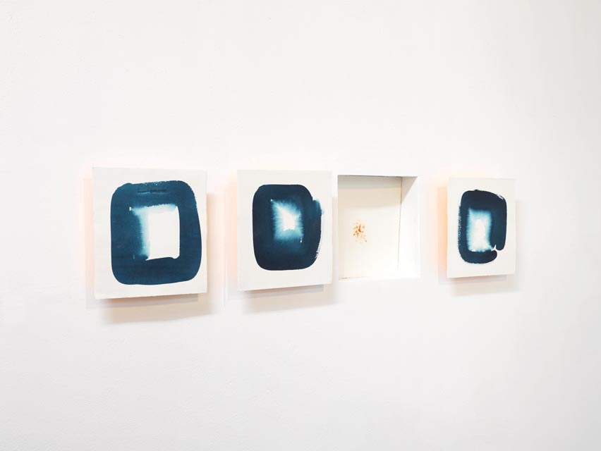 I am inspired by the contradistinctive values of the medium I am using and search for the tension within one color. I strive to create a sense of fluidity and solidity by creating within one image autonomous effects; the directness of my brushstroke against the rushing and gradual fading of the color towards the white of the background.