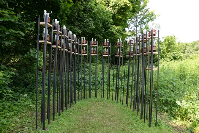 Much ( 2014) Dimensions variable. Wax, copper, steel, glass bottles, leather, tar, coffee, wood and concrete.