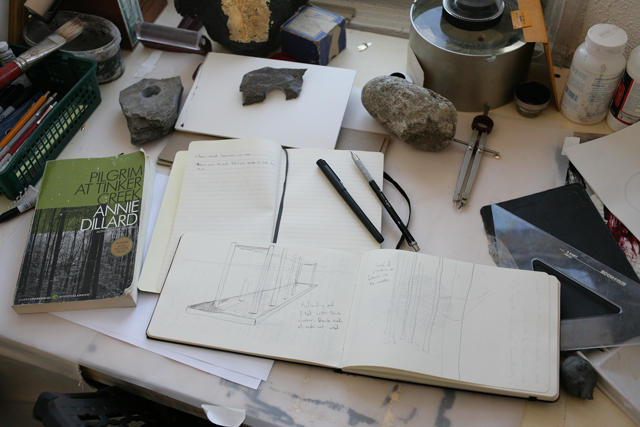 I draw influence from many writers and artist. Recently the most impactful have been Ann Hamilton and Annie Dillard. Dillard especially has such a wonderful voice that is wistful and wandering while heavy as the Old Testament. Another great poet that I love is Wendell Berry. Anyone who sees mystical meaning in physical objects will find that i am a fan of their work.
