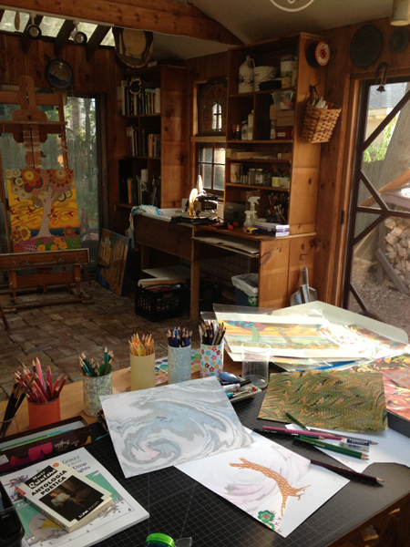 I have the most wonderful studio in the backyard of my house, built by my husband and his mother when he was seventeen to be her pottery studio. After grad school, I spent two months cleaning it up, leveling the loose brick floor, recycling wood and building shelves and tables, getting my collection of books and art materials organized. I love working alone in there – when Virginia Woolf wrote “A Room of Her Own”, I feel that she wrote it for me. My studio is my sanctuary, a place where I spend most of the day happily at work.