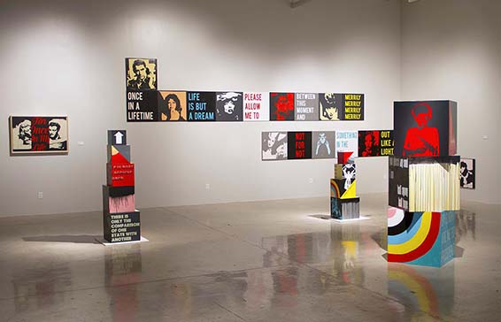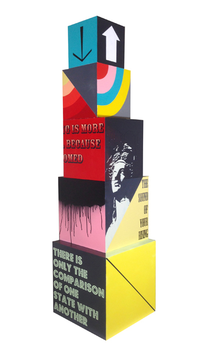 My artwork consists of installations, sculptures, paintings and work in other media inspired by the combination of word and image in communication and meaning-making. More specifically I am influenced by a huge spectrum of fields and interests: psychology, Social Influence Theory, propaganda, modern advertising practices, Classic literature, silent films, pop culture, Renaissance art history, Greco-Roman history, and so on. This seemingly disconnected slew of influences is sort of mirrored in my work. I combine numerous references and stylizations that may seem unrelated and assemble them in a manner that threads a loose thematic continuum, forms a dialogue between them. Bringing these different elements together into a whole is somewhat like composing notes in music. It feels a lot like writing a poem, especially working on my sculptures or installations. Each image or text reference functions like a symbol. How each viewer puts the puzzle of symbols together is where the works breathe and become their own living whole. Overall, you could say my work is a colorful long-form study of modern communication and meaning-making amidst the poetry of movement in space.