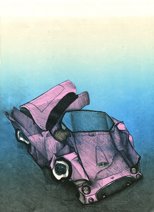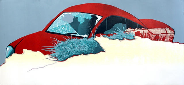 paper and on canvas. Her prints rarely deviate from the 8color crayon box palette, and when paired with thick line work, they become unobtrusive representations of fateful vehicular collisions. The pieces are superficially innocuous, even playful, but the lack of human presence makes the deserted, crumpled automobiles all the more perplexing.