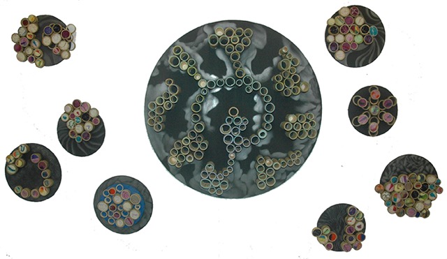 Call and Response with 8 Satellites, large disc 36” smaller discs, bamboo, hand made felt, sewing, dye, metallic wool on black gesso panels , 8” -10”, 2014