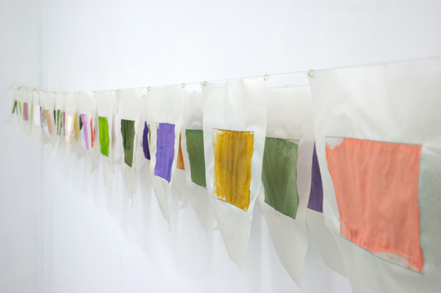 (detail) Color changes in the forest, during one year, at the same location. 6 inches x 12 feet 9 inches, acrylic on Juan silk, brass 2015