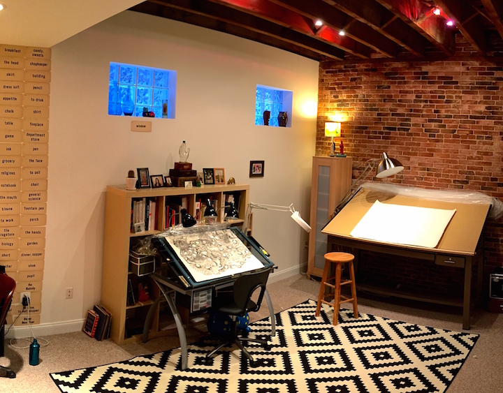 I literally lived in my studio until I moved a couple months ago. Now I sleep and eat in different parts of the house but still spend 80% of my time in my private space. My studio isn’t solely for my practice as a visual artist. I have all my gear for making electronic music and turntable down here…and I do mundane things like send emails, pay bills, and buy records from Discogs. Actually, I guess I still do live in my studio. What can I say? Old habits die hard. I think I need to be close to my work because, when I take breaks from life, I can either work or just spend time with my pieces; figure out the next plan of attack or put my ‘In Session’ sign on the door and kick out the jams for seven hours.
