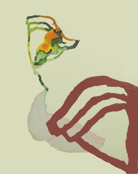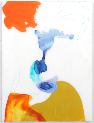 As a way to begin my recent series of paintings, I pour thin acrylic paint onto drafting plastic. I carefully cut out the shapes where the dried paint has pooled and use them as collage elements. The forms I discover briefly coalesce into monsters and cartoon characters, only to dissolve again into pigment, binder and surface. The uniquely human tendency to see objects or figures in clouds and tea leaves is what I explore in my work. I paint on a variety of surfaces, mining content from the chance discovery of shapes.