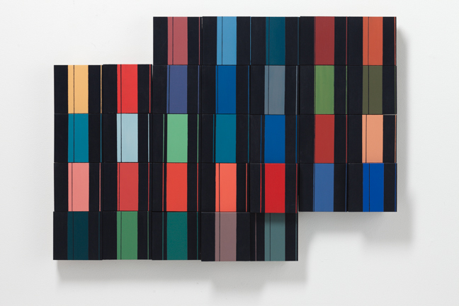 In my Year in Color works, I seek to render abstract concepts, such as time and its measurement, into an abstract visual vocabulary. I began this body of work in 2011 when I took up the practice of creating a small painting for each day using a complex color that has been made by mixing a simple set of primary acrylic and gouache pigments and white. Every panel differed in tone and composition, showcasing a color mixed uniquely for that day. This practice was an attempt to translate and capture each day’s unique experiences, activities, and moods. With varying annual rules and limitations for each subsequent year’s incarnation, I have continued this exploration of the interplay between structure, intent, and chance to create a record of time – that is both a narrative and a record of time.