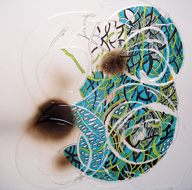 Vortex # 11: 2015, fire, hot glue, Prismacolor premium on paper 8 x 8″