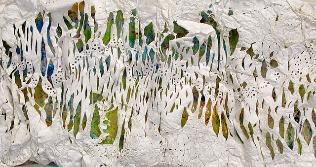Scales: 2012 mixed media Tyvek, plastic, acrylic 20 x 31 x 2″