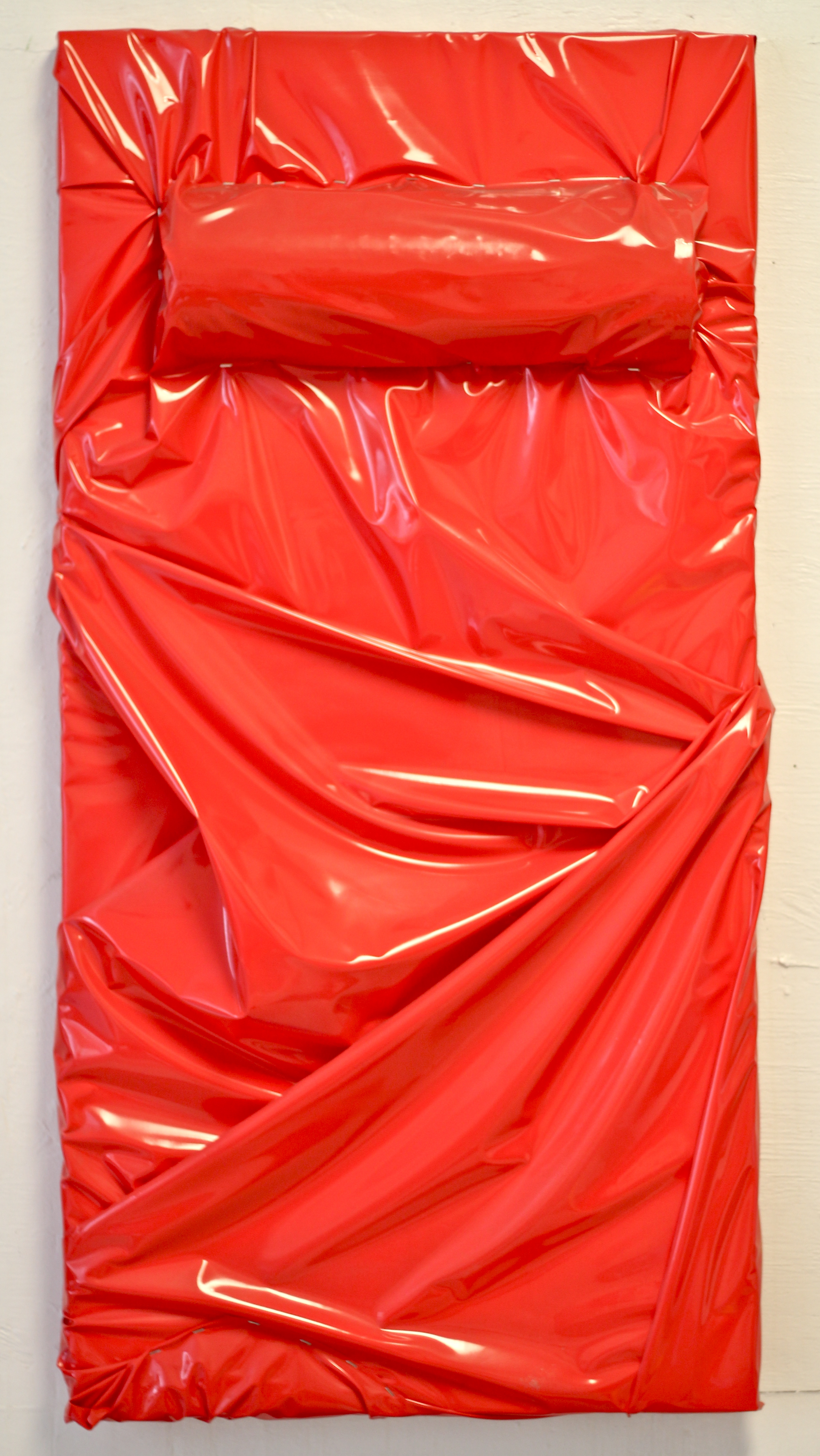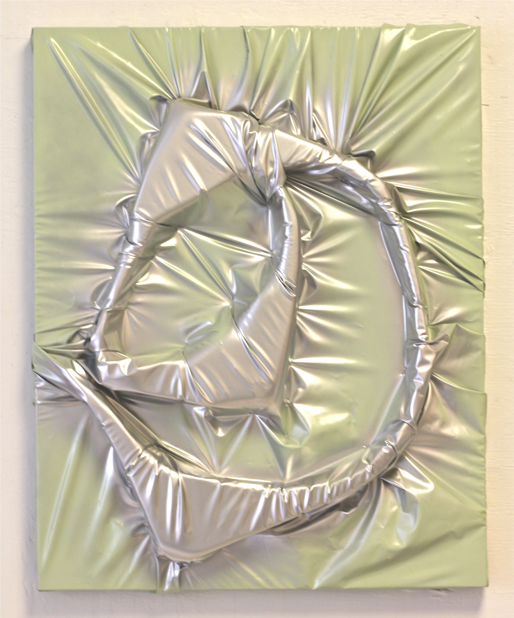 My work is a continued and varied exploration of the duality and potential visual intrigue of materials. The materials that I chose to manipulate rely on the optical seduction of their superficial, synthetic, and slick surfaces. These “tease” paintings as I call them pull you in with heir sensuous surfaces and yet repel you with their reflective nature. Their simple formal compositions highlight these materials and best illustrate their tactility in their pared down arrangements, I see the vinyl as a transforming medium that emphasizes the literal physical presence of objects and forces the viewer to perceive physical reality of the object and its existence in his or her space. The attitude and style of the materials create flashy objects that call attention to themselves. I want the pieces to appear to be tough and assertive, yet gentle, familiar, and inviting thereby initiating a dialogue with the viewer. Ultimately I strive to create works that are embedded with a sense of joy, and are simultaneously fun and smart, while also being critical yet playful.