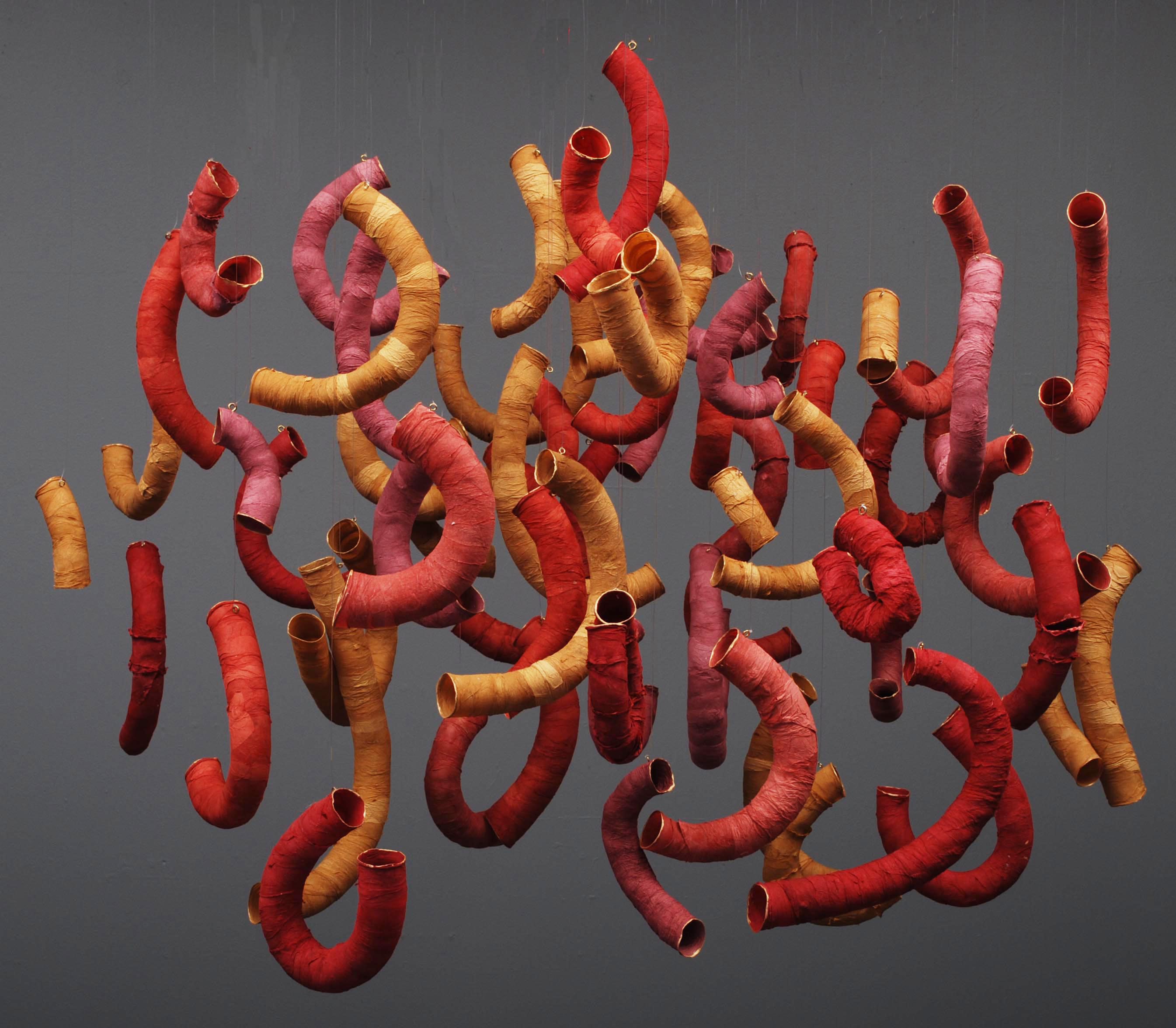 For me, paper is the ideal medium to explore these concepts. Paper itself is complex. It is light, responds to movement and appears fragile. As a paper sculptor, I know that it is also pliable, absorbs color beautifully, and is very strong. Abaca, the fiber I use most often, shrinks as it dries, adding the element of chance to all my work. I also enjoy the process of papermaking because of my love of water, for its beauty, sensuality and for its healing qualities.