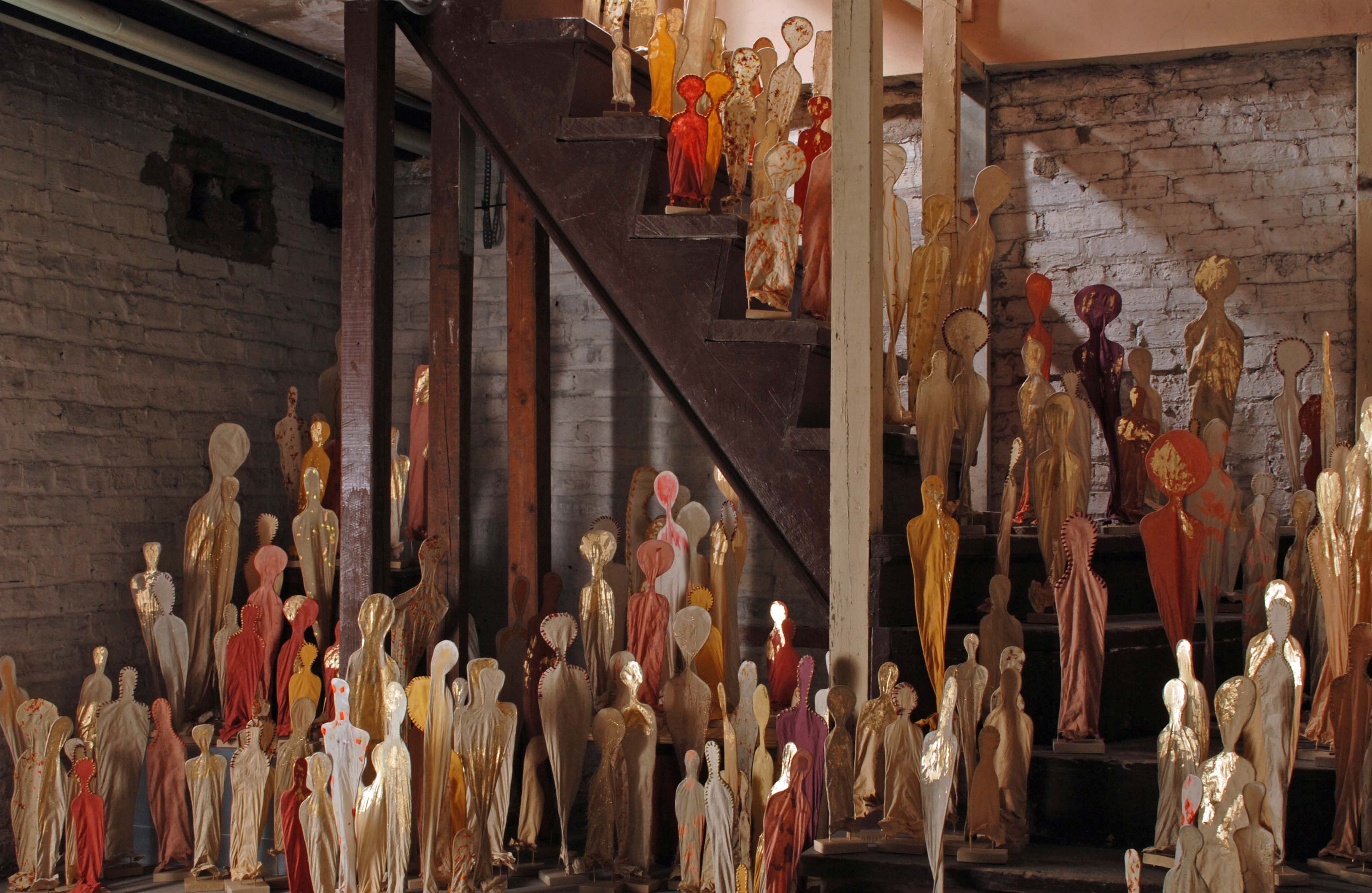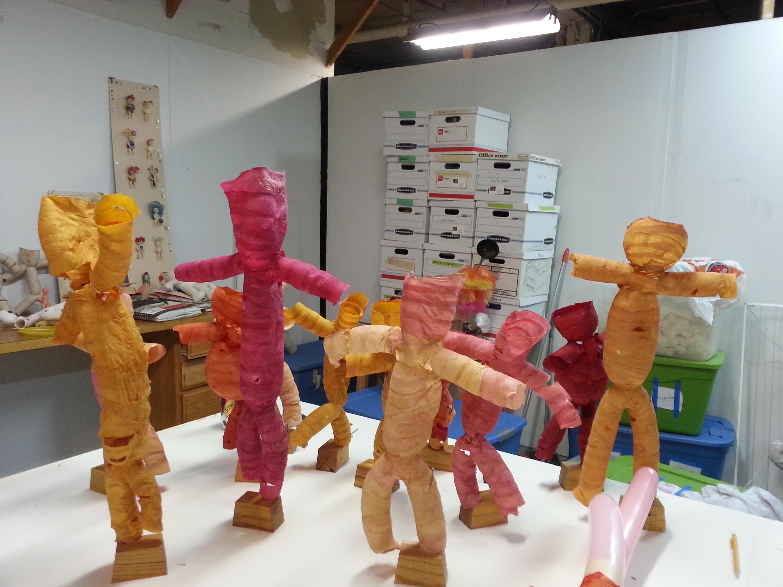 One very recent influence is an exhibit of Haitian art at the Field Museum in Chicago. I was mesmerized by the large red and black figures that were created as sentinels for a ceremonial space. In response I created forty small, whimsical paper sculptures that are also sentinels.