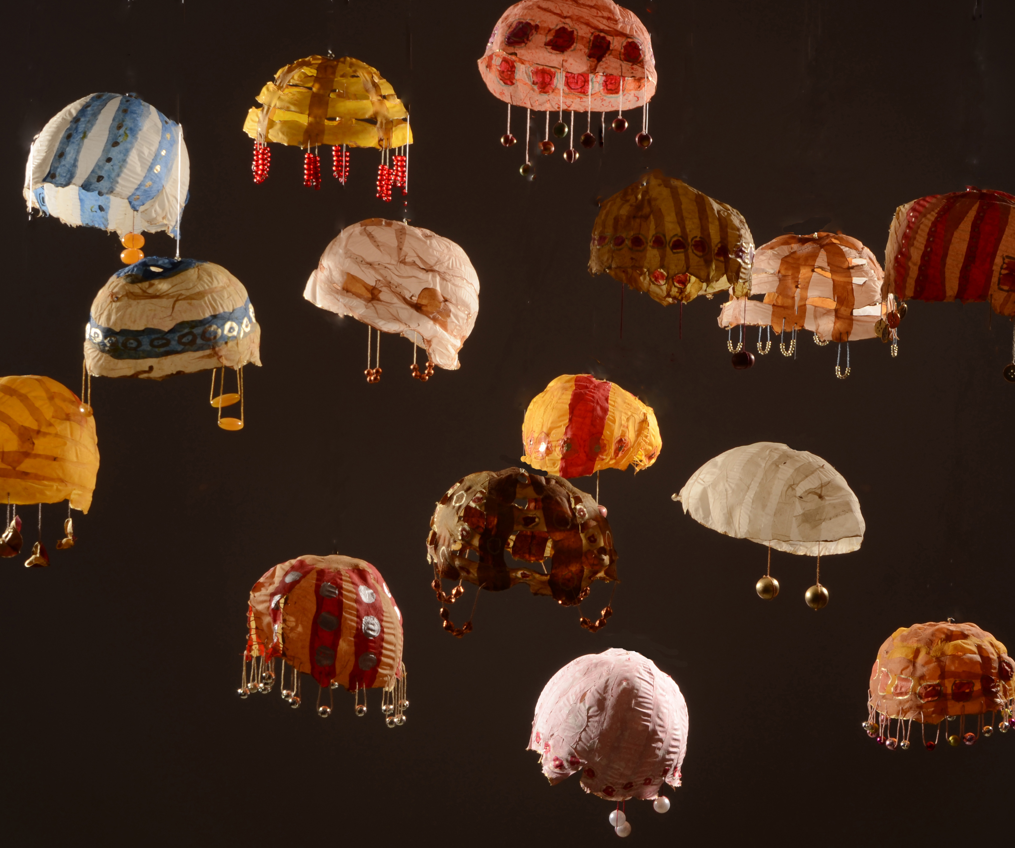 I make sculptures with handmade paper. With these sculptures I try to access something beyond our concrete world and to find meaning and comfort through doing so. Sometimes I do this very directly, as in my piece “A Full Taste of Happiness”, an installation of hundreds of Buddha-like sculptures, and at other times indirectly, as in the abstract hanging sculptures I call “Healing Machines.”