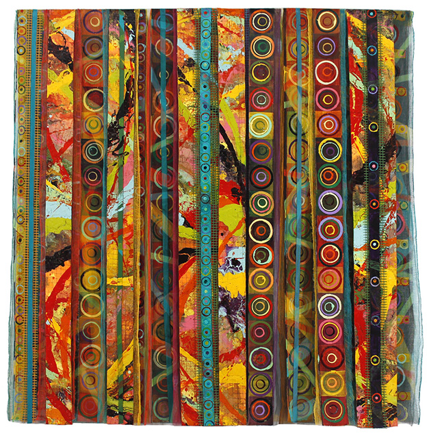 In my mixed media works, paint is applied to canvas, cheesecloth, nylon and aluminum screens, plastic, and rug-hold. These materials are torn or cut into strips, reassembled in layers, and suspended from wooden supports. In my works on paper, the physical layering is achieved through painterly illusions or paper cutting.