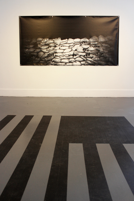(on wall) Anti-Fascist Protection Rampart, 2014, digital print on vinyl, 48” x 96”; and