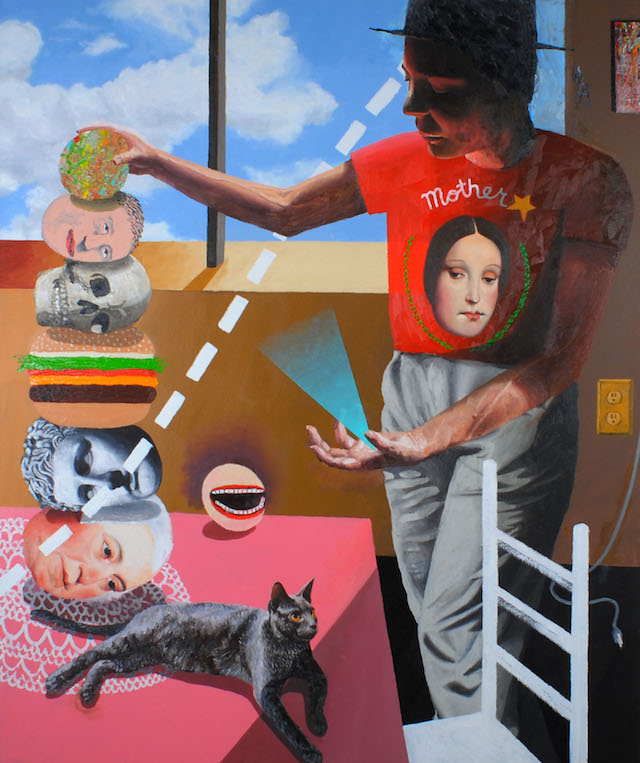 Enigmatic narrative paintings, if I’m being as brief as possible. But, a little less brief, my paintings are imagined situations or struggles dealing with the nature of meaning and knowledge, which simultaneously navigate the possibilities and place of fiction and narrative in painting.