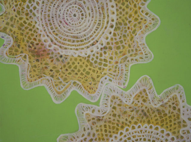 This most recent body of work is an homage to my mother. I began collecting doilies after she died because they reminded me of her. Painting each one in the collection is my way of honoring the handiwork of the makers. My goal is to create 86 individual pieces, my mother’s age when she died from Alzheimer’s disease.