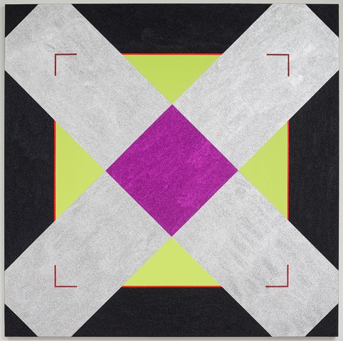I paint—acrylic on canvas on panel. My paintings are hard-edge geometric abstractions with some elements from light and space and color theory. I use glitter for light/color-shifts and I use color for the afterimage. The viewer can, with a glance, get what the painting is about but with a slightly extended involvement, they can get more out of it. To experience the color/light-shift, one must move around a piece, and for the afterimage, one must take the time to stare into a point on the painting for around 30 seconds and then glance at a white wall. That effect never gets old for me. It’s an apparition that appears out of nowhere, and the boldness of the colors…even though I know exactly what color it is going to be without having to stare, the way your eye can create that glow is still a novelty for me, after so many years. It surprises me how many people don’t know about it! It’s really fun to be the one to show them for the first time!