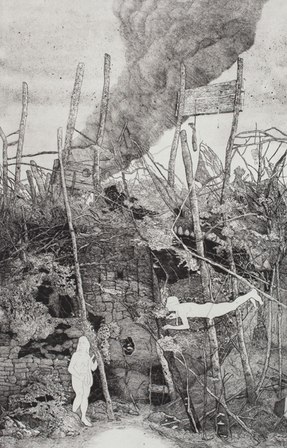 I create figurative landscapes of individuals traversing a harsh, post-civilized environment. These images examine one’s relationship within a society increasingly devoid of shared meaning or consequence. Detached figures are left to meander through an anonymous world, performing acts of violence and deviance. Attempts at reconciling lost purpose arise in the form of futile contraptions or makeshift rituals.