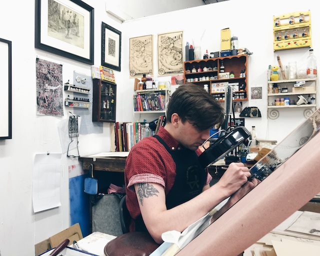 My studio practice probably seems painfully traditional to some. The process for each piece can be lengthy, so time in the studio is essential if I want to maintain a consistent output. I keep a minimum 40-hour week in the studio in addition to any other obligations I may have. The actual work taking place in the studio consists of preliminary drawing and sketching, a lot of drawing on the copper, and the occasional night at the press to proof or edition a plate.