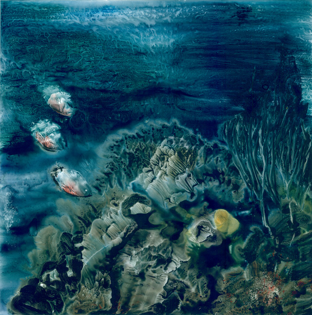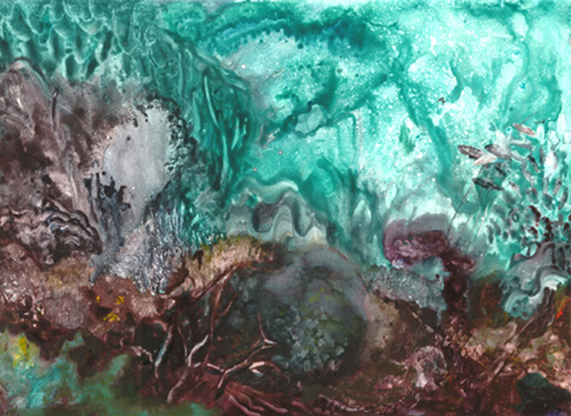 The flora and fauna that I have explored as a SCUBA diver, and the experience of being in that flow, is what I seek to share in my painting. As that world has come under increasing attack – 40% of the coral reef is now damaged – I have sought ways to respond in my art. I’d been a political activist for many years, beginning with the Vietnam War, but sought refuge from the world’s troubles in my art. When the BP oil spill in the Gulf of Mexico happened five years ago, I understood that I could no longer separate my two worlds. Integrating them has been harder than I imagined. I am not a conceptual artist, and I have no interest in creating heavy-handed propaganda. The challenge was pointed out to me by the artist Heidi Fasnacht, who suggested that I would have to change my artistic persona to address the oil spill in my work. She said I would need to transform my perspective from protector of the environment to destroyer. I’ve been working on it for five years now.