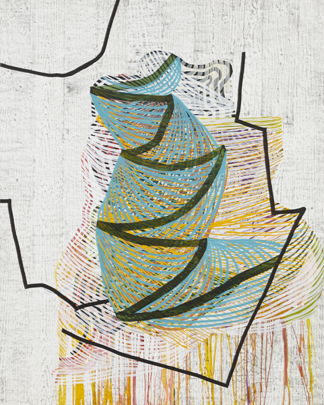 All of my paintings begin on a lustrous bright white sheet of yupo with graphite rubbing of wood grain from the pressure treated decking behind my kitchen. Both the wood and paper are man made: improved upon. This simultaneously toxic and natural impression is captured on synthetic Japanese paper made of polypropylene—which ironically, is a “green” material. On top of this I create layered biomorphic abstractions composed of accumulated mark making and large areas of transparent and painterly color. I incorporate my surroundings, personal experience and environmental concerns into the work, including the pervasive infiltration of chemicals into our daily lives, by combining organic forms, stringy and obsessive lines, pipes, bony protrusions, then viscous pours, slip trailing of paint and direct graphite rubbings of wood grain. My vocabulary has evolved out of the visual residue of making photographs, prints, ceramic objects and drawings as well as the continuous reprocessing my own paintings as source material. Scale and variation contribute to the evolution and create a structure for decision making. I document the work at regular intervals using an iphone and rework and reenvision the photos using drawing apps. These pictures trace the evolution of the layers of imagery within each painting and also serve as source material as a body of work unfolds.