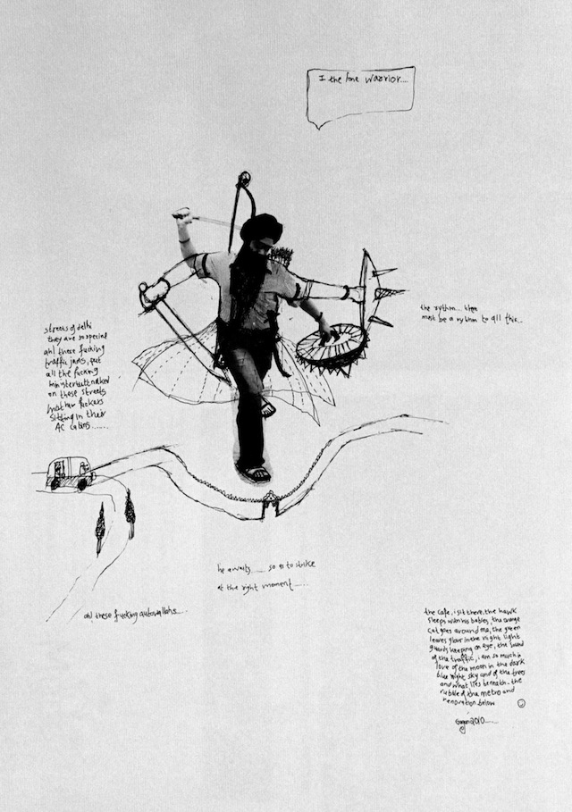 In the five years, 2010 onwards, i have seen a shift in the line, from being a smooth line to becoming a broken line, from drawings from reading history, works on erotic art to capturing day to day events, a sense or reportage to also just picking a theme, like what happens if i fall, how can i go on falling, what is a fall? So i never worked like this earlier. Earlier it was enacting a past event. But the scale and tools and the medium have more or less remained the same, like a small sketchbook, around A 5, pen on paper and sketching. From being inside a studio to being completely outdoors. And only recently i worked or created works on humour which earlier were not so prominent in my practice.