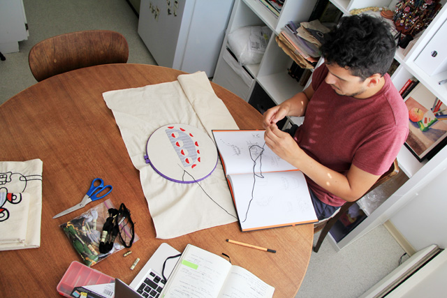 I work at home most of the time. My family is there and I love that. It keeps me in perfect balance between life and work. I think the studio creates a distance between you and your surroundings. I am not against art studios and I even used to have one. My “studio” is being with my family, sharing a coffee with friends, walking in the street, and observing situations taking place around me and, of course, sitting down and working on projects, mostly at my kitchen table.