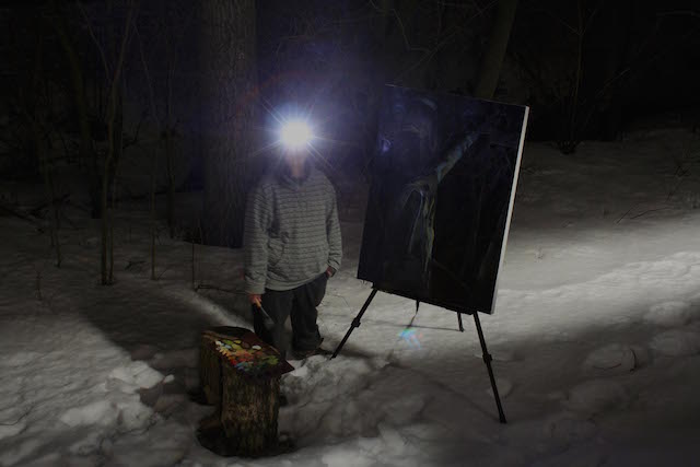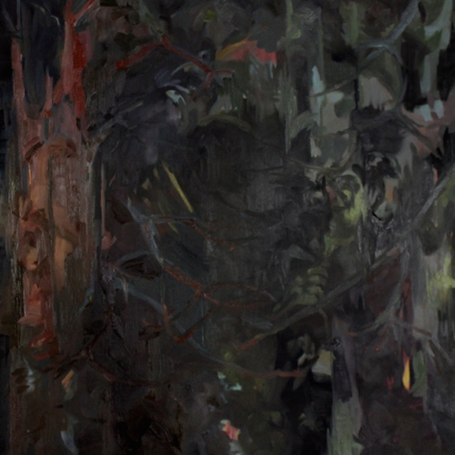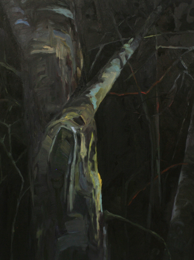 My paintings are from on-site observation and are produced out of the experience. They are not literal representations of the forest but are examining the overwhelmingness of this interaction with nature. As our world becomes more technologically driven our experience with nature becomes less direct, mediated through screens, my paintings question ones relationship to nature. Challenging the assumptions of what nature is, how we come to know it, and ultimately, how we interact with it. For me, the night is more alive than the day, especially in the forest. Our visual faculties are lessened by the dark and we are constantly looking to identify noises or smells we are encountering. This results in not truly seeing the forest but feeling it. Our senses are being overwhelmed. My paintings are rooted in this particular action. The seeing but not seeing, the not seeing but feeling.