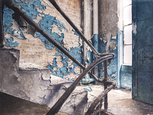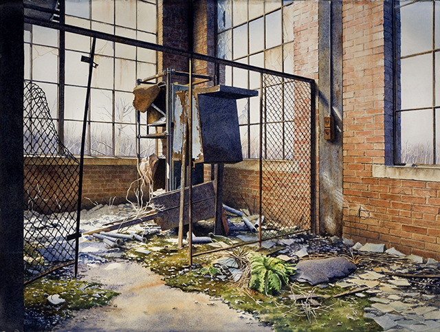 The apparent struggle between the natural and synthetic worlds has long been the subject of painters and photographers alike. I intend that the rusted, crumbling objects and spaces that I chose to paint stand as monuments, not to human ingenuity, but as documentation of the process by which the remnants of industry and invention often fade. I offer gentle reminders that nothing of this world truly lasts-no human innovations, inventions, nor material aspirations. In the processes of oxidation and decomposition, human imposed “order” tends toward the apparent disarray of natural order, and it is here that I’ve encountered captivating beauty. I propose that these images bear witness to the simultaneously destructive and restorative essence of that struggle.